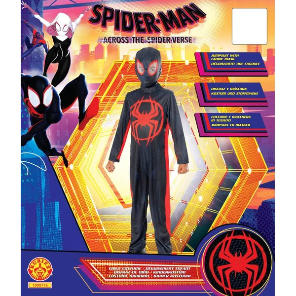 Une combinaison à manches longues en jersey imprimé rouge et noir avec logo de Spider-Man sur le buste. Une cagoule assortie avec ouvertures pour les yeux et attache velcro dans le cou..