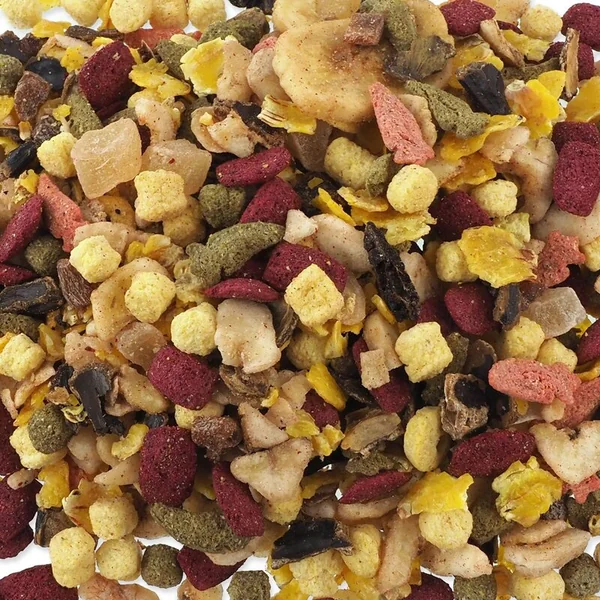 - Les bananes séchées, abricots, ananas et noix de coco garantissent une grande appétence de l’aliment. Les morceaux de caroube, flocons de maïs et betterave rouge sont bénéfiques pour le bon fonctionnement de la digestion.
