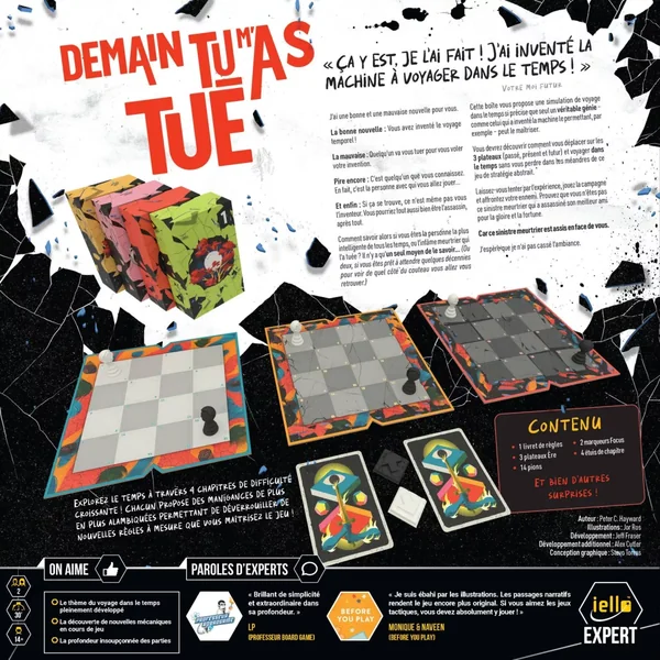 Demain tu m’as tué est un jeu de stratégie narratif abstrait sur le temps et l’assassinat, qui introduit de nouveaux scénarios avec des règles et des composants uniques pendant que vous jouez. Comme pour n’importe quel jeu qui consiste à fouiller dans le temps, vous devez parcourir ce contenu dans un ordre strict et inaltérable .