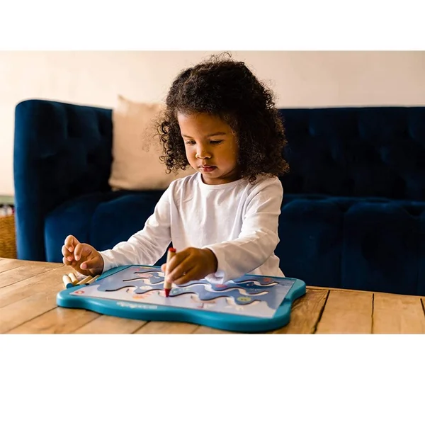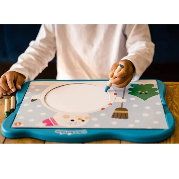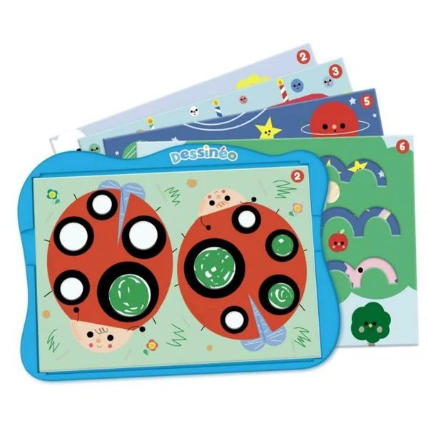 Un premier jeu pour apprendre à faire ses premiers traits et motifs grâce à 16 modèles de dessins évolutifs. Les pochoirs en carton guident le trait de l’enfant et l’accompagnent pour passer du gribouillage aux premiers traits maitrisés. Une fois le trait réalisé il peut retirer le pochoir et terminer son dessin et laissant parler son imagination.