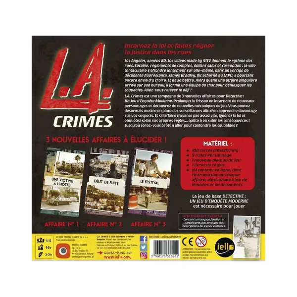 Cette extension pour Detective : un Jeu d’Enquête Moderne contient trois nouvelles affaires formant une campagne des plus palpitantes. L.A. Crimes prolonge l’expérience du jeu de base en vous proposant d’incarner de nouveaux personnages et de vous confronter à de nouvelles mécaniques de jeu. Vous devrez mettre en place des surveillances afin d’en apprendre davantage sur vos suspects et vous accumulerez rapidement du stress lorsque vous déciderez de faire de menues entorses au règlement, en voulant rapidement mettre les criminels derrière les barreaux ! Jusqu’où serez-vous prêt à aller ?