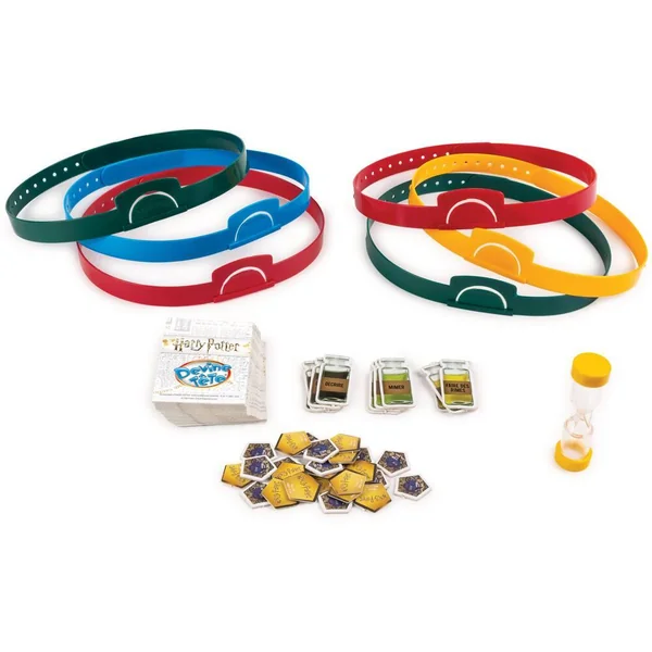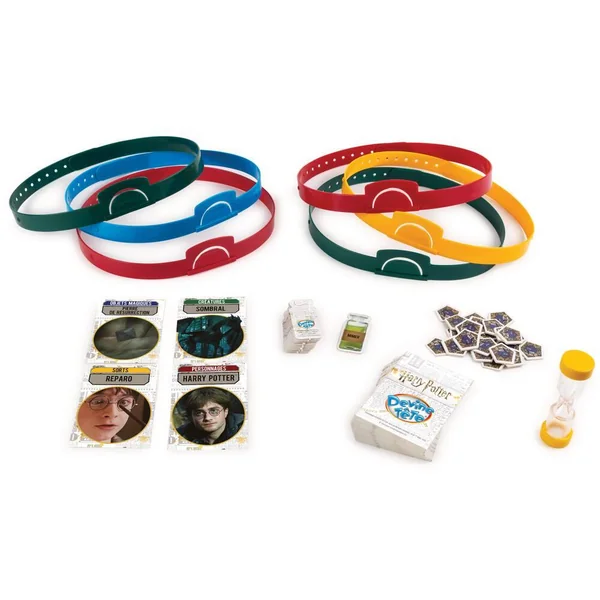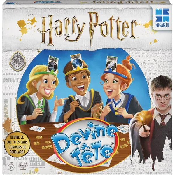 Devine ce que tu es dans l’univers de Poudlard ! Une adaptation du grand classique DEVINE TETE à l’univers HARRY POTTER. Posez le maximum de questions en un temps limité pour deviner le personnage, la créature, l’objet magique ou le sort représenté sur la carte qui est sur votre tête : Harry Potter, Gobelin, Le journal de Tom Jedusor ou bien encore le sort Endoloris ? Oui mais qu’est-ce que c’est ? Dépêchez-vous car tout le monde le sait sauf vous ! Si vous devinez ce qui se trouve sur votre carte, c’est un jeton chocogrenouille de gagné ! Contenu : 72 cartes, 12 jetons de potion, 25 jetons chocogrenouille, 6 bandeaux, 1 sablier, 1 règle de jeu.