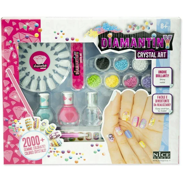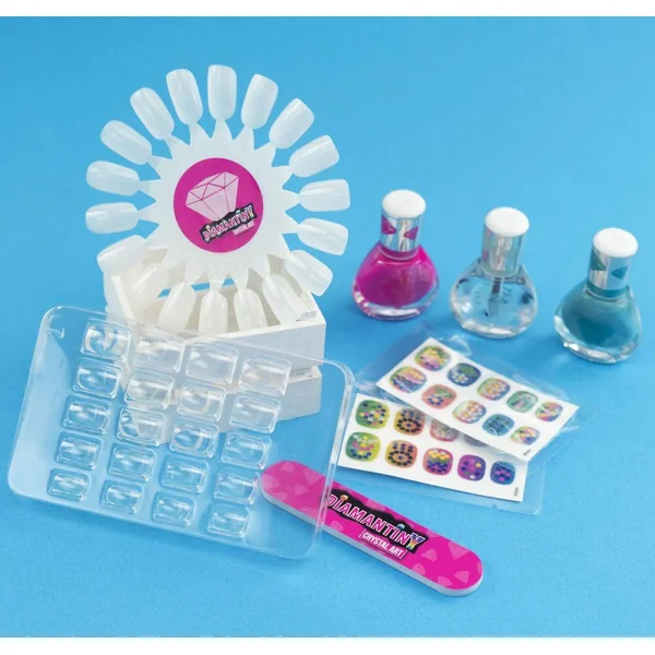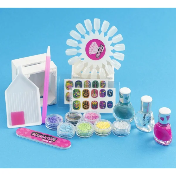 Contient : testeur de dessin, set de faux ongles à décorer, stickers avec guide d’activités, 3 vernis à ongles, kit de décoration complet avec 7 couleurs de gemmes.
