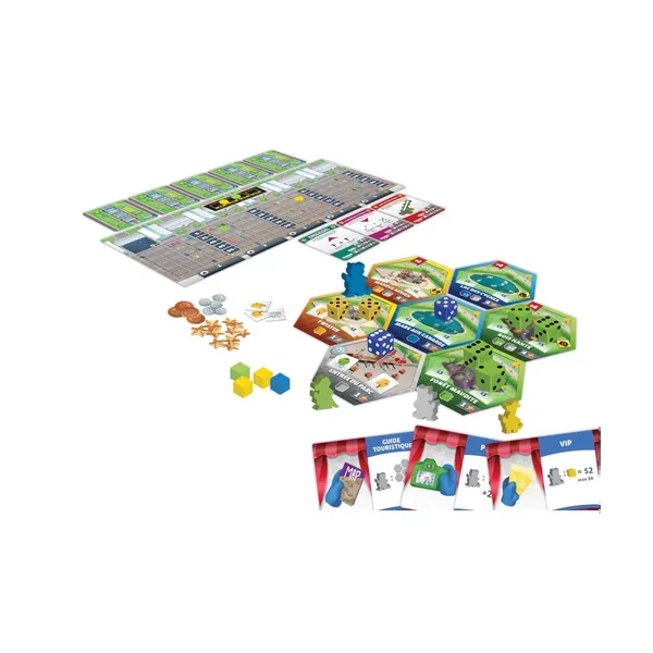 Les dés du jeu représentent les clients, avec des tuiles hexagonales représentant les manèges de votre parc. En utilisant un mécanisme unique de « cascade de dés » une fois qu’un client a profité d’un tour, la valeur de ses dés est réduite, mais il peut toujours continuer à profiter de plus de manèges dans le parc à thème jusqu’à ce que sa valeur tombe à 0 à sa sortie.
