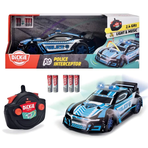 Voiture radiocommandée Police Interceptor de 22cm – Équipée d’une télécommande avec fonctions complètes de pilotage (avance/recule/droite/gauche), et fonctions sonores et lumineuses – Voiture radiocommandée avec une fréquence de 2,4Ghz – Vitesse supérieur à 9km/h – 5 piles LR06 non incluses –
