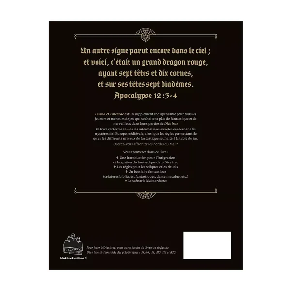 Divina et Tenebrae est un supplément indispensable pour tous les joueurs et meneurs de jeu qui souhaitent plus de fantastique et de merveilleux dans leurs parties de Dies irae.