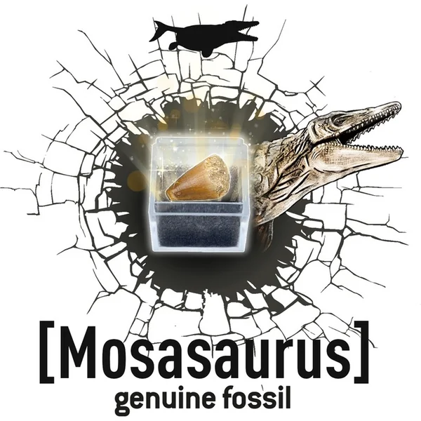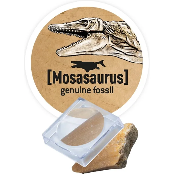 En bonus, tu trouveras dans le kit une vraie dent de Mosasaure (environ 2 cm), que tu peux observer à la loupe dans une boîte de grossissement portable – idéale pour l’exploration et à emporter avec soi.