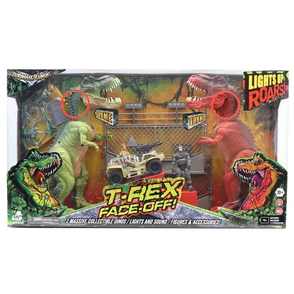 Jurassic Clash. Joue une scène de bataille entre les 2 féroces dinosaures T. Rex et 2 hommes. Chaque dinosaure est articulé avec effets sonores et lumineux : les yeux s’allument, il émet un rugissement effrayant et la mâchoire aux grandes dents est articulée. Ce coffret complet contient : 2 dinosaures articulés de 30.5 cm, 2 figurines articulées de 9.5 cm, un véhicule roues libres et des accessoires. En plastique. Dimensions : d’un T. Rex : 37.5 x 12.5 x 30.5 cm, du véhicule 15 x 7.8 x 7.2 cm.