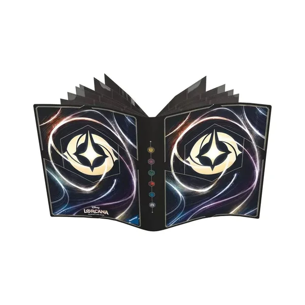 Ce Portfolio au format A4 peut contenir 252 cartes au format standard 63x88mm. La couverture présente l’illustration des dos de cartes Lorcana.