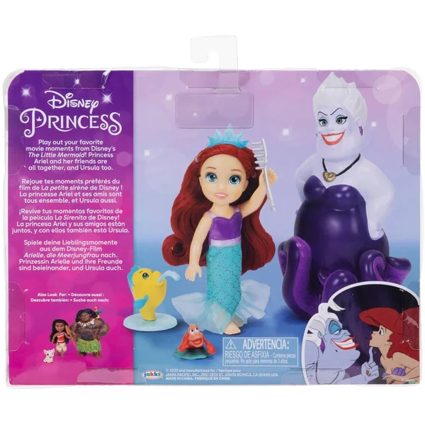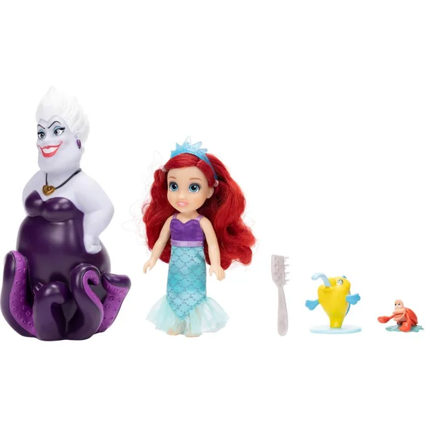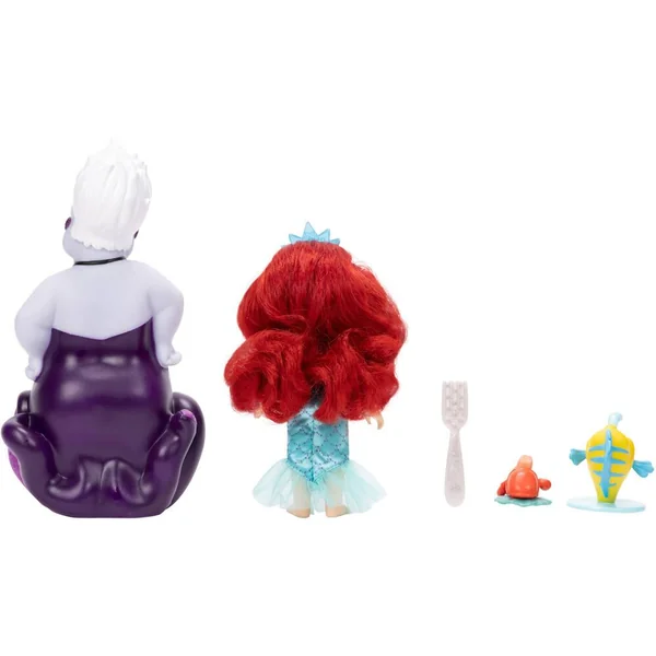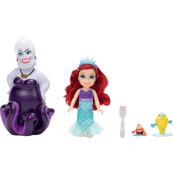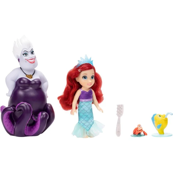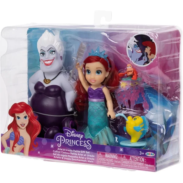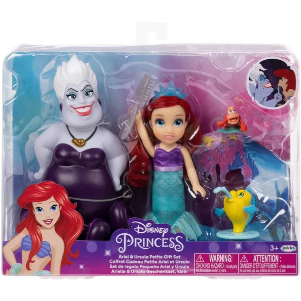 Coffret Disney Princesses comprenant deux poupées de 15 cm (Ariel et Ursula) et des accessoires. Contenu : 2 poupée de 15 cm, 2 petites figurines (Sébastien et Polochon) et 1 peigne (brosse à cheveux). Instructions imprimées sur la boîte.