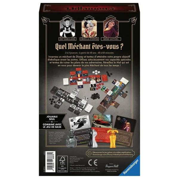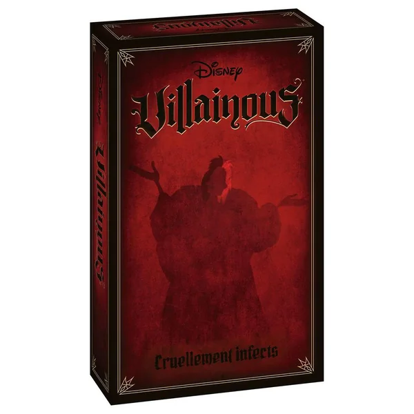 Entrez dans la peau de 3 nouveaux Méchants Disney : Cruella des 101 dalmatiens, Mère Gothel de Raiponce et Pat Hibulaire un classique des méchants disney. Suivez votre propre objectif diabolique pour gagner le titre de pireméchant de tous les temps ! Pour y parvenir, utilisez astucieusement vos capacités spéciales et tentez de ruinez les plans de vos adversaires. Car ce n’est qu’en dictant avec succès vos règles aux héros de Disney que vous pourrez espérer une fin… malheureuse ! Découvrez 3 nouveaux personnages, soit 3 nouveaux objectifs et 3 nouvelles manières de jouer pour devenir le plus grand méchant Disney : – Cruella d’Enfer usera des pires ruses pour récupérer 99 chiots et s’en faire un manteau – Mère Gothel tentera d’empêcher Raiponce de retourner à Corona en gagnant sa confiance – Pat Hibulaire devra réaliser non pas 1 mais 4 objectifs pour devenir le plus grand Méchant de Disney !Utilisez astucieusement vos capacités spéciales et tentez de ruiner les plans de vos adversaires. Cette extension de Villainous, le jeu le plus diabolique de l’année, est jouable avec ou sans le jeu de base. Réveillez le Mal qui est en vous et devenez le pire Méchant de tous les temps ! Dès 10 ans.