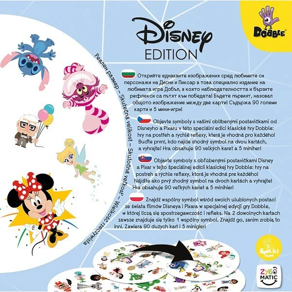 Découvrez des symboles avec vos personnages préférés de Disney et Pixar dans cette édition spéciale du jeu classique Dobble : un jeu d’observation et de réflexes rapides, adapté à tous ! Soyez le premier à trouver le symbole identique sur deux cartes et gagnez ! Le jeu comprend 90 grandes cartes (plus grandes que dans le jeu classique Dobble) et 5 mini-jeux !
