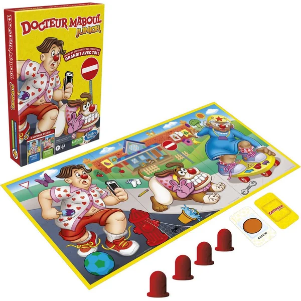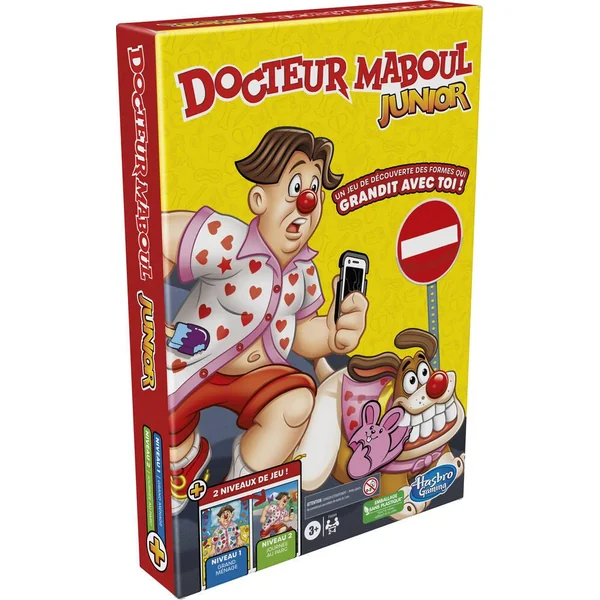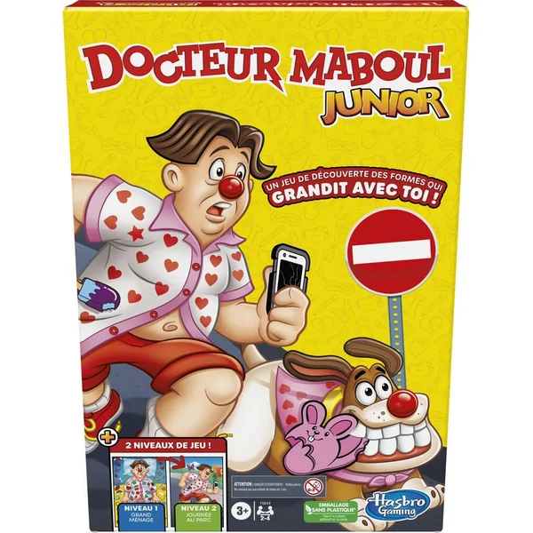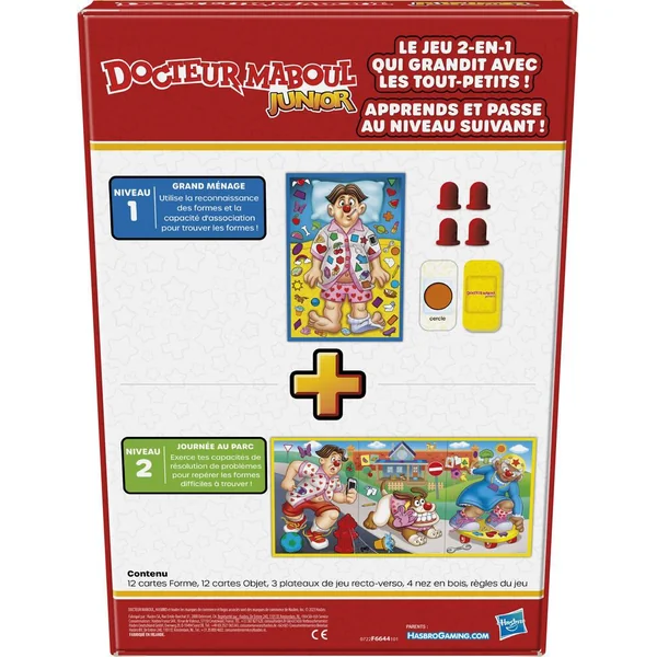 Un jeu 2 en 1 ! Docteur Maboul Junior est un jeu de découverte des formes qui grandit avec les tout-petits. Les joueurs retournent les cartes Forme et les cartes Objet à tour de rôle. Au Niveau 1 Grand ménage, les joueurs font la course pour trouver les images sur l’un des 3 plateaux (au choix). Au Niveau 2 Journée au parc, ils retournent les plateaux et les lient pour créer une scène amusante pleine d’objets plus difficiles à trouver. Aux deux niveaux, le premier joueur à placer le nez de Sam sur la forme ou l’objet qui correspond à celui sur la carte la récupère. Le joueur avec le plus de cartes à la fin de la partie gagne ! Ce jeu est vendu dans un emballage sans plastique et inclut 4 nez en bois certifiés FSC, ainsi que 12 cartes Forme, 12 cartes Objet et 3 plateaux réversibles faits de produits en papier certifiés FSC. Un jeu amusant pour enfants pour s’amuser entre amis, en classe et lors d’une soirée de jeux en famille. Operation, Hasbro et tous les termes associés sont des marques de commerce de Hasbro.