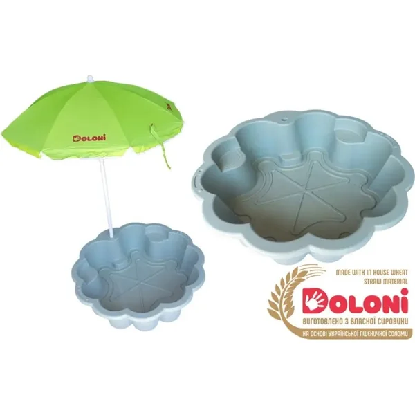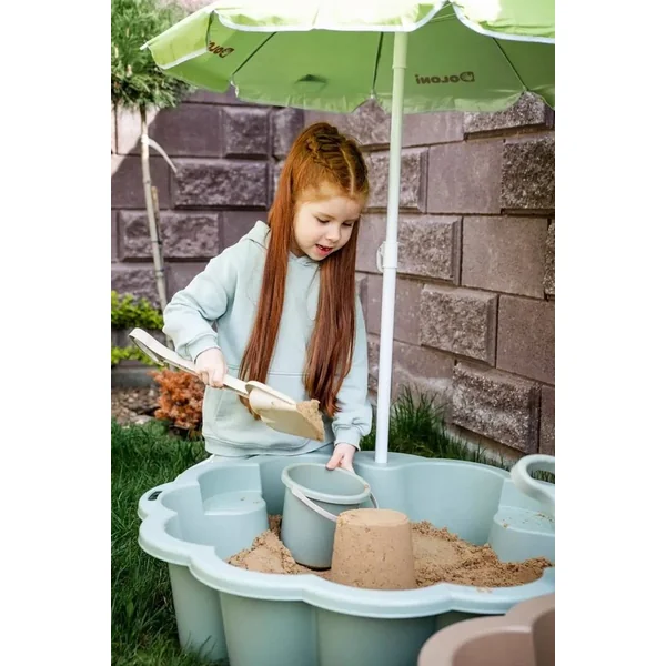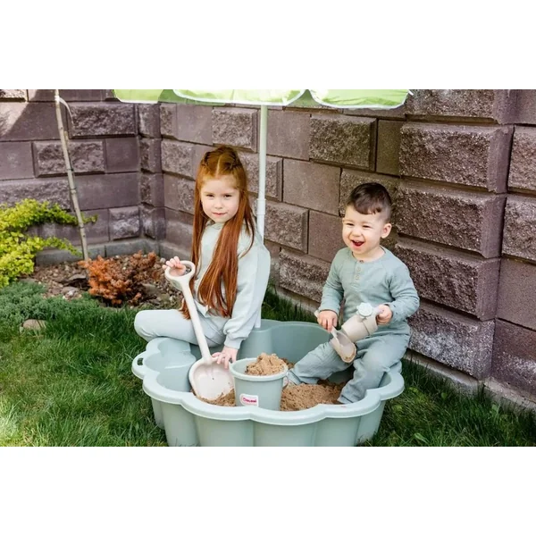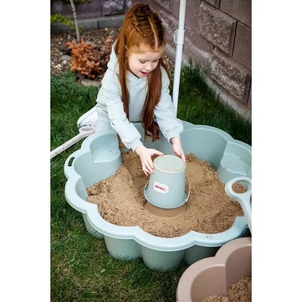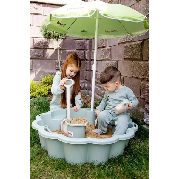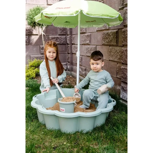 Un bac à sable en forme de fleur avec 2 sièges intérieurs et un parasol.
