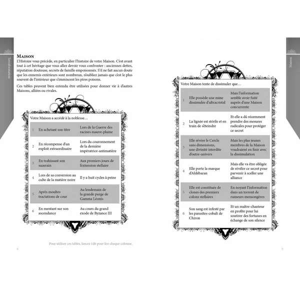 Utilisez des tables aléatoires pour peupler votre univers et personnaliser rapidement planètes, personnages, créatures étranges, historiques et intrigues de votre campagne.
