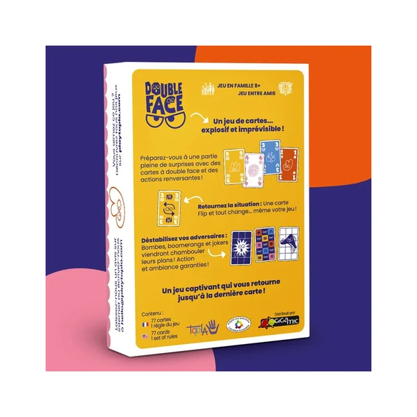 Double Face est un jeu drôle où la stratégie, l’audace et un soupçon de chance se combinent et créent une formidable ambiance !