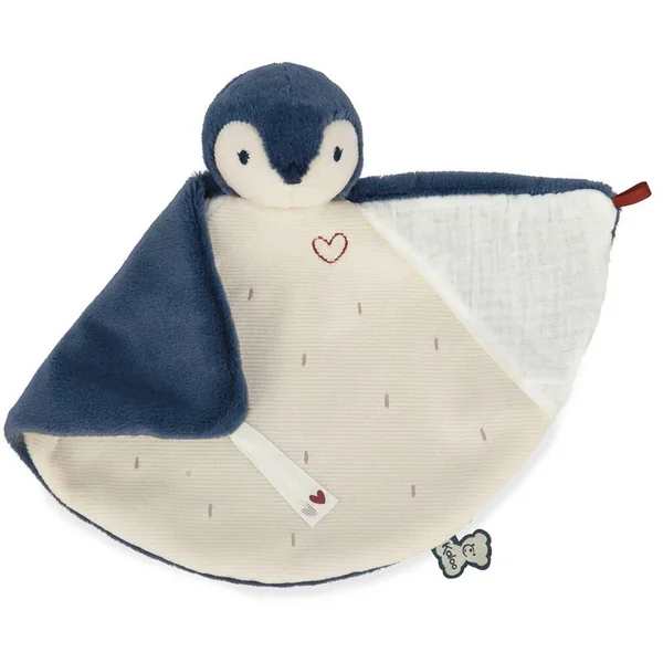 En plus de cette variété de matières agréables à parcourir, ce doudou bleu arbore un joli cœur brodé, symbole de toute l’affection que vous portez à bébé. Synonyme de protection et d’attachement, un ruban décoré d’un cœur permet de nouer les ailes du manchot entre elles. Cela peut aussi être très pratique pour y accrocher une tétine !