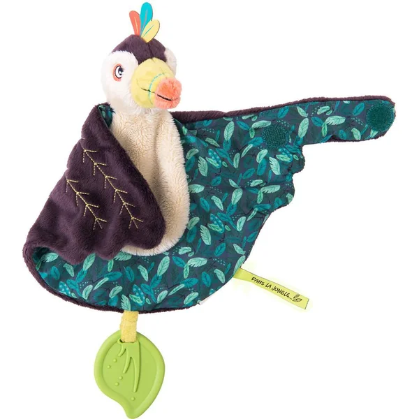 Ce doudou toucan crème et noir aux touches de couleurs vives, déploie ses grandes ailes aux motifs feuilles pour envelopper bébé de douceur et de tendresse. Comporte une attache-tétine et une spatule dentaire bleue.