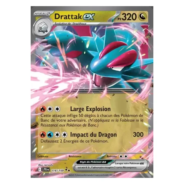Découvrez Drattak (jtg114), une carte Pokémon de l’extension Aventures Ensembles, provenant du bloc Écarlate & Violet. Idéale pour compléter votre collection, cette carte Double Rare plaira autant aux collectionneurs qu’aux joueurs.