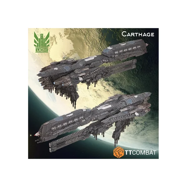 À l’instar de sa classe sœur, le Babylon, le Carthage est configuré pour l’anéantissement des navires ennemis. Le Carthage se concentre presque entièrement sur les dommages cinétiques, en s’appuyant sur deux énormes moteurs de masse UF-12000 montés sur un support frontal fixe. Il conserve la capacité de transport de flotte de son frère pour une puissance stratégique accrue. Si des armes à énergie sont nécessaires, ses tourelles UF-4200 peuvent être transformées en deux lasers lourds Cobra, une option qu’il partage avec d’autres cuirassés de l’UCM.