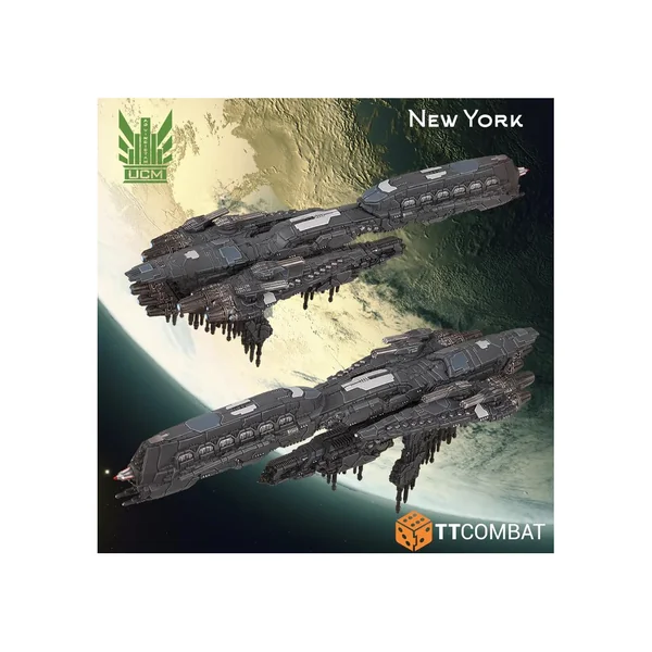 La classe New York est l’un des navires les plus demandés de l’UCMF, car sa flexibilité et sa puissance impressionnante sont presque inégalées. Développé ultérieurement à partir de la classe Beijing, il remplace les tourelles lourdes de cette dernière par un gigantesque hangar à vaisseau vide permettant de lancer des dizaines de chasseurs et de bombardiers meurtriers. Il remplace également le laser Cobra par un énorme tube à torpilles et un espace de stockage interne pour deux de ces munitions dévastatrices.