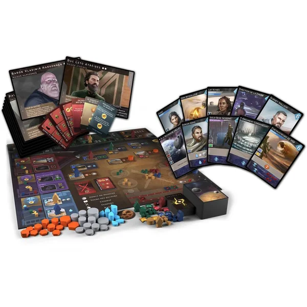 Dune : Imperium emploie le deck-building pour ajouter une mécanique astucieuse d’informations cachées au traditionnel placement d’ouvriers. Vous commencez avec une carte de leader, et un deck identique pour tous les joueurs. Alors que vous allez acquérir de nouvelles cartes et façonner votre deck, vos choix définiront vos forces et vos faiblesses. Ces cartes vous permettent d’envoyer vos Agents sur les différents lieux du plateau de jeu, votre stratégie est donc affectée par l’évolution-même de votre deck.