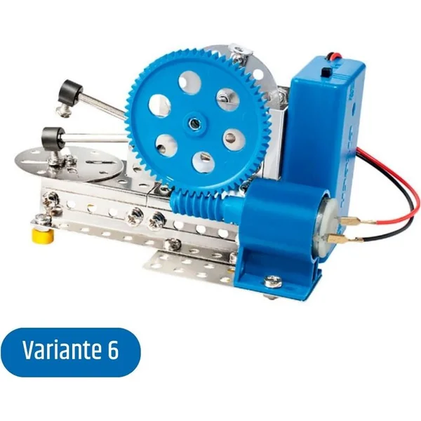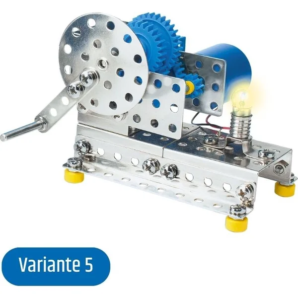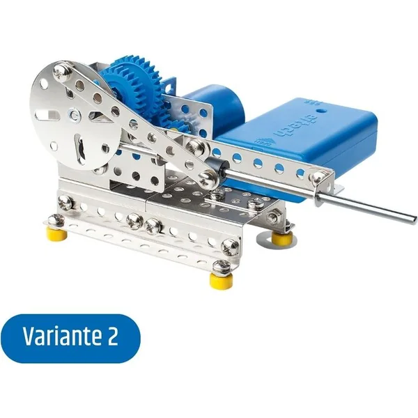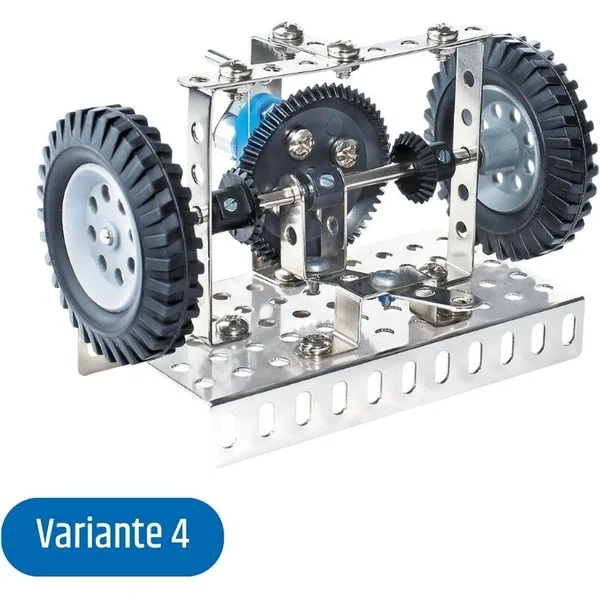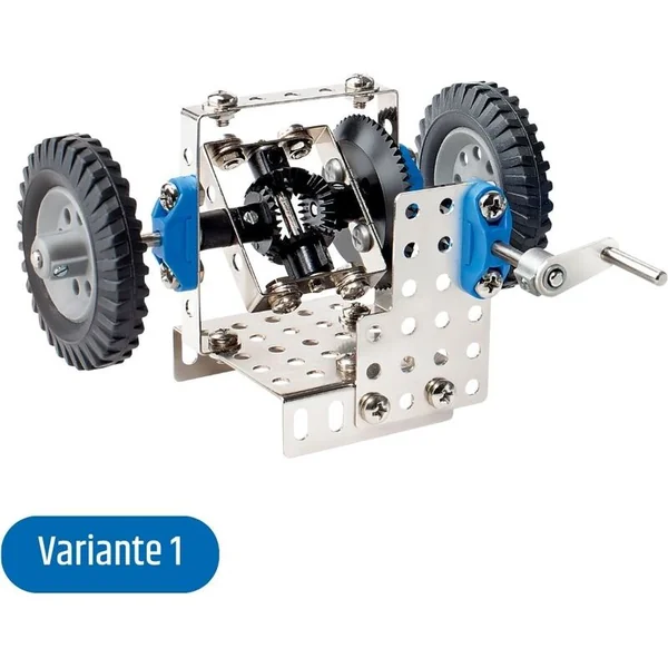 Le kit de construction métallique Eitech 00007 contient toutes les pièces nécessaires pour assembler au moins six modèles. Les enfants peuvent construire différents mécanismes de transmission – un différentiel, une scie, une horloge, un mécanisme à marteau, un générateur et un pignon. De manière ludique, ils acquièrent ainsi une idée du fonctionnement de différents types de transmissions.