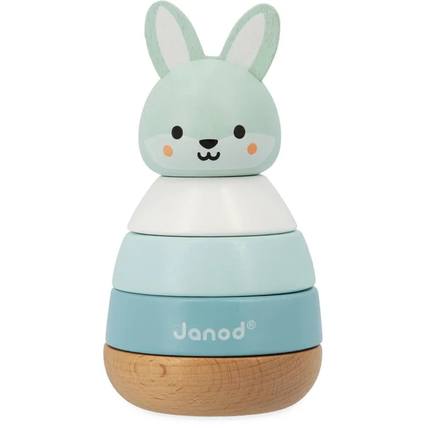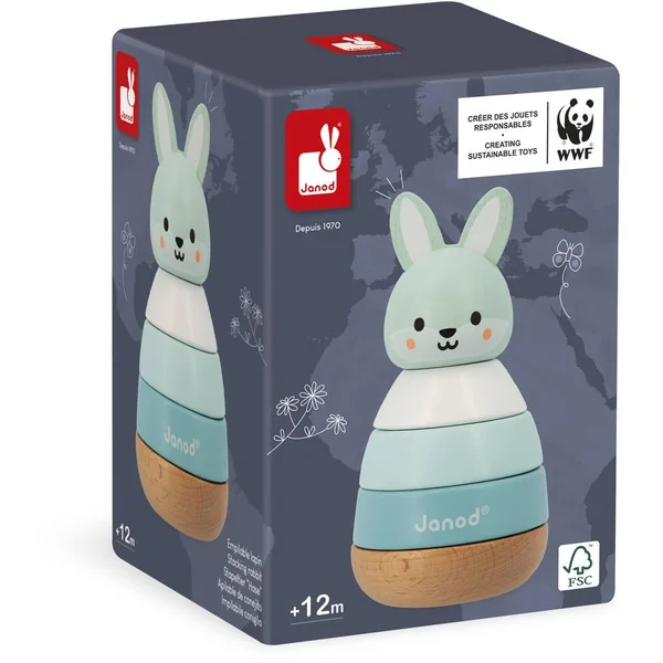 Joli lapin en bois massif à empiler. 4 pièces de tailles et de couleurs différentes sont à empiler dans le bon ordre pour reconstituer le lapin. Idéal pour développer la motricité fine et aider l’enfant à se familiariser avec les tailles et les couleurs. Jouet en bois FSC™.