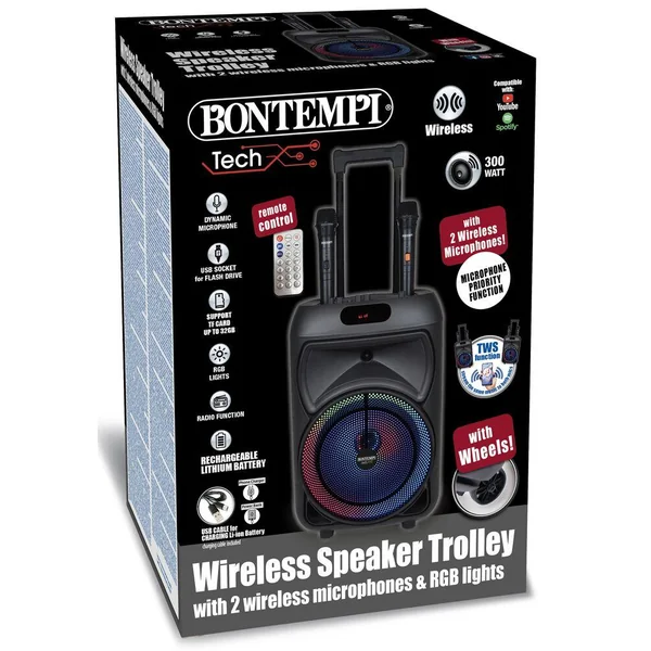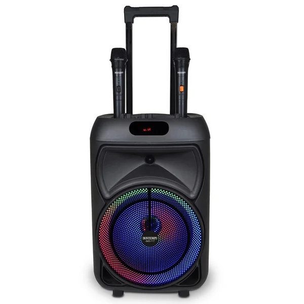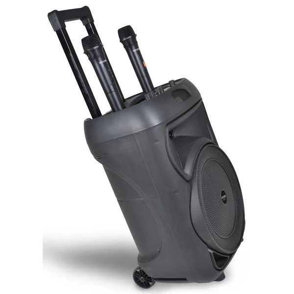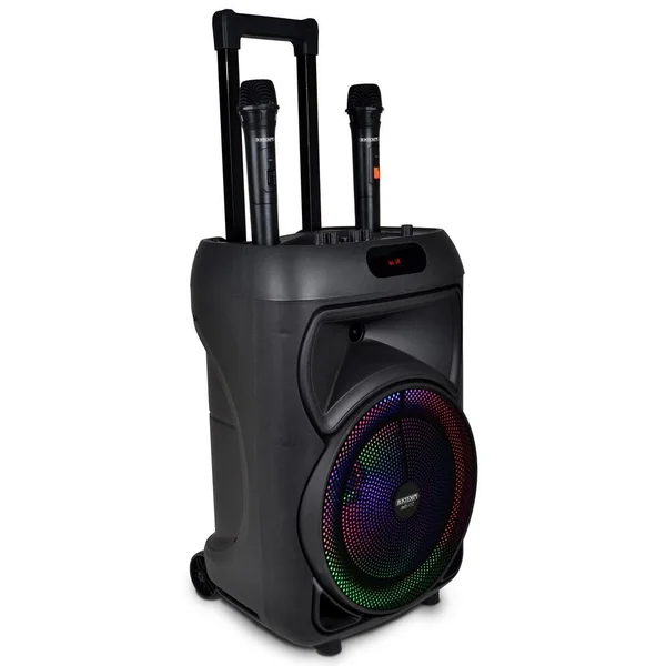 Haut-parleur sans fil à roulettes avec 2 microphones sans fil et lumières RVB • Télécommande • Ecran pour visualiser les fonctions courantes •