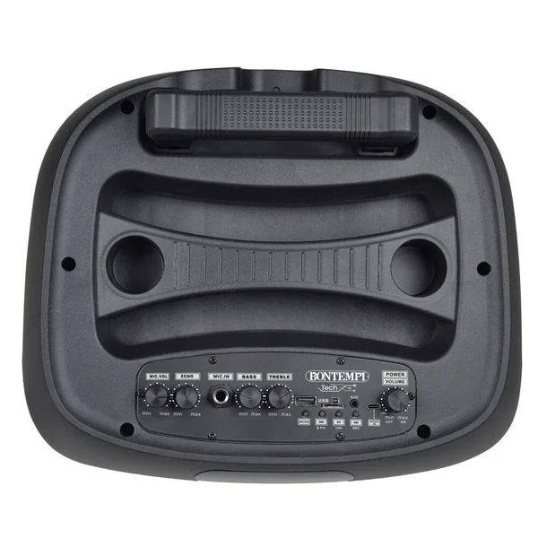 Fonction radio • Réglage de l’effet écho • Réglage volume du micro • Égalisateur • Enregistrement de la voix • Fonction priorité microphone • Touche d’activation des effets lumineux • Prise USB Type-C pour recharger la batterie au lithium (câble de charge fourni).