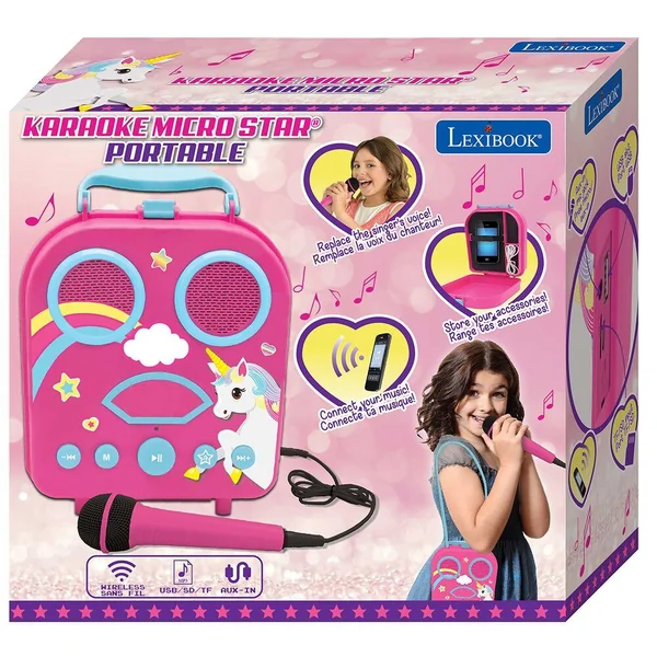 2 microphones inclus Impression très qualitative sur toute la surface du boîtier pour une belle personnalisation Bouton de changement de son magiqueLes microphones peuvent être rangés à l’arrière de la chaîne stéréoBatterie rechargeable USB-C (câble inclus)Possibilité de basculer entre les modes Bluetooth, USB et carte mémoire