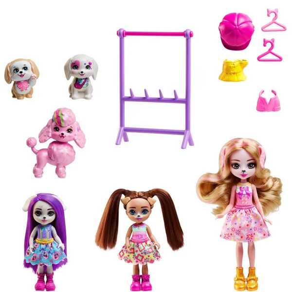 La famille des chiens fait du shopping ! Grande sœur et petites sœurs cherchent une tenue pour habiller les 2 chiots sous le regard amusé du caniche.
