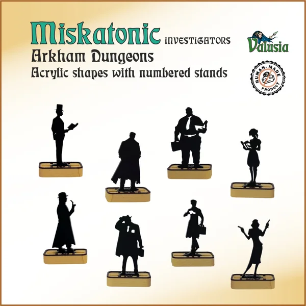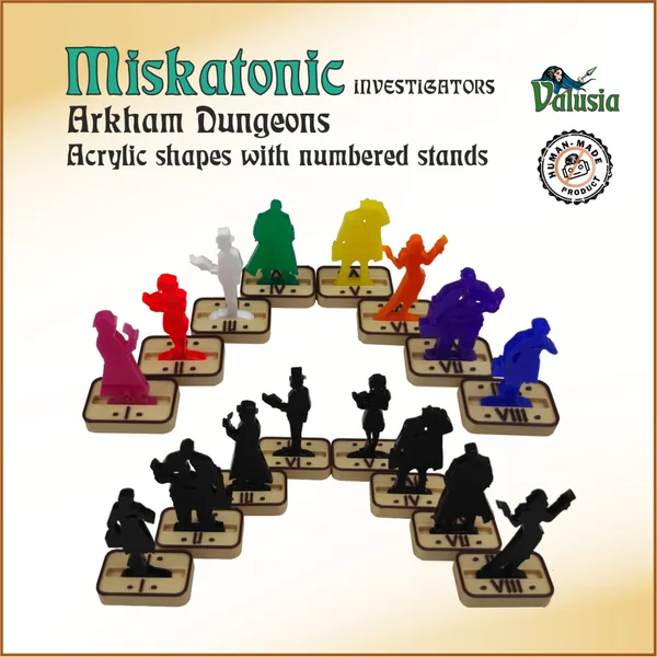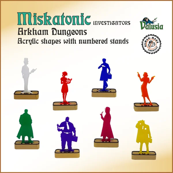 MISKATONIC INVESTIGATORS – un ensemble de 8 formes en acrylique avec des supports numérotés. Solution robuste, abordable et pratique, aucune peinture nécessaire. Les supports sont numérotés pour une gestion facile, très pratique pour tout joueur ou maître de jeu. Les supports mesurent seulement 15 mm de largeur, permettant aux modèles de se faufiler dans des couloirs étroits.
