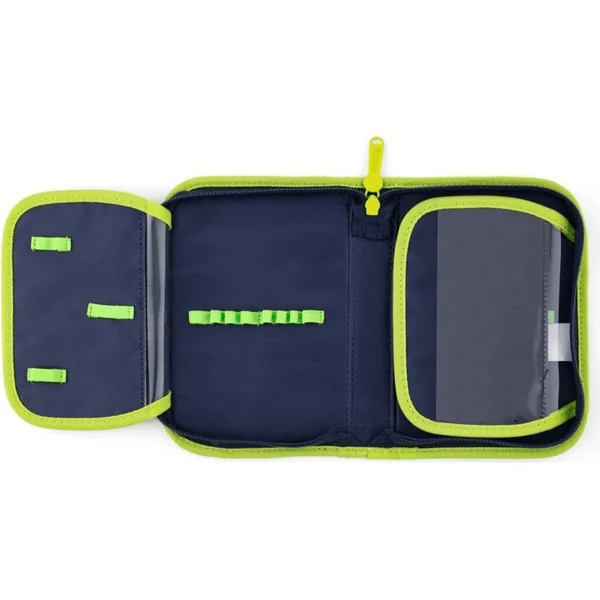 - À un étage avec deux rabats, des passants pour les fournitures d’écriture et une feuille transparente pour l’emploi du temps.