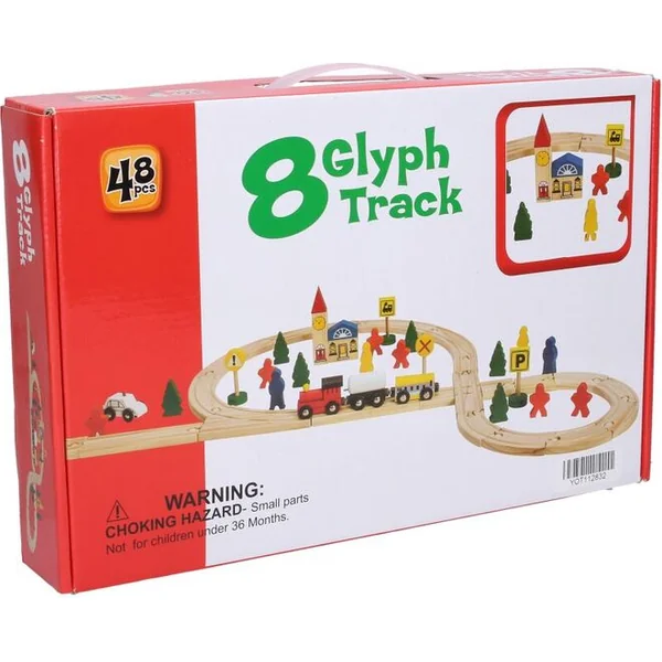 Comprend des rails en bois, des figurines, un train avec des wagons connectables par magnet, une voiture, un bâtiment, des panneaux de signalisation.