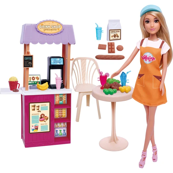Découvrez la magie d’un café et devenez barista dans votre propre coin de jeu. Ce set comprend une poupée en robe orange, un stand avec une machine à café, une table et une chaise, ainsi que divers verres et aliments.