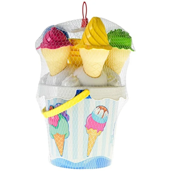 Comprend un seau, 4 cornets, 4 chapeaux colorés en forme de glace, une pelle et un moule en forme de petit gobelet.