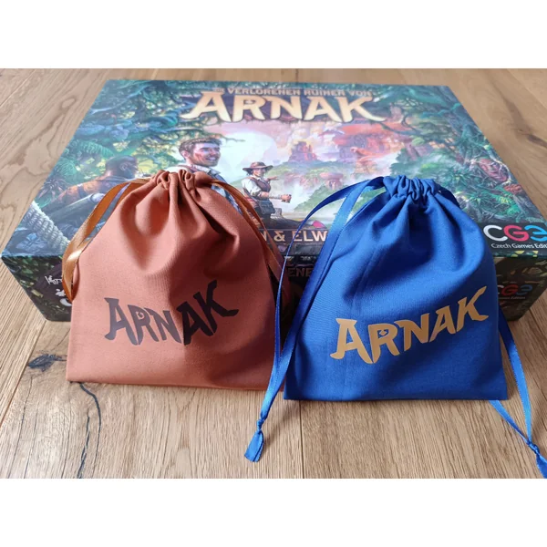 Lot de deux sacs compatibles avec le jeu Les Ruines Perdues de Narak, bleu foncé et brun rouille, avec un logo assorti. Les tuiles bonus de totem et de recherche peuvent désormais être rangées, triées et facilement retirées des sacs pendant la partie. Plus besoin de les mélanger en cachette sur la table. Installation rapide, rangement élégant et superbe présentation visuelle, tout-en-un !