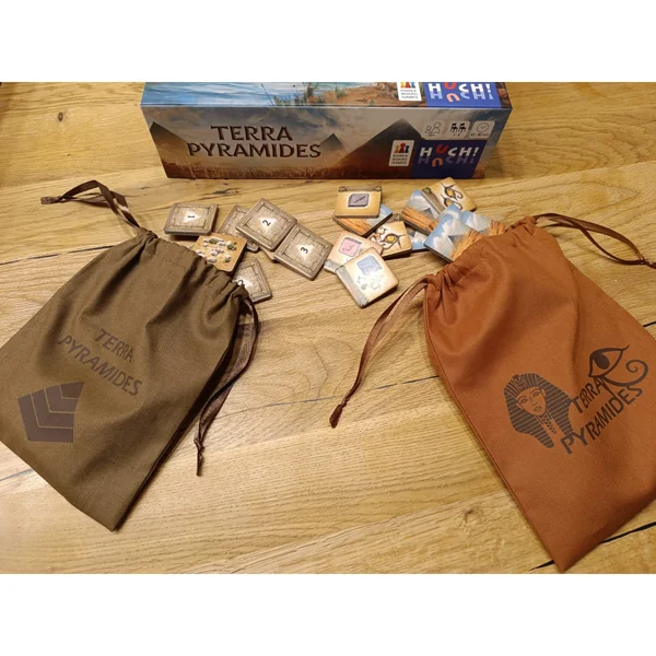 Lot de 2 sacs pour le jeu de société Terra Pyramides, dans des tons bruns assortis avec logos brun foncé ou dorés. Les fondations et les dalles d’escalier se retirent facilement des sacs. Plus besoin de mélanger les tuiles ! Installation rapide, rangement esthétique et présentation visuelle optimale !