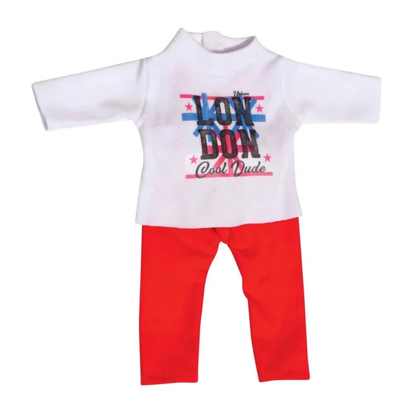 Le set contient 1 pantalon rouge et 1 haut blanc avec un motif cool. Il est compatible avec les poupées de 38 cm. 33% coton et 67% polyester. Séchage à l’air libre. Ne pas repasser.