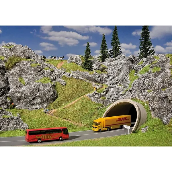 Entrée de tunnel de construction moderne. Utilisable pour trafic ferroviaire sur 2 voies, même avec caténaires, ou pour trafic routier sur 2 voies (Car System). Avec l’élément constituant la galerie de tunnel.