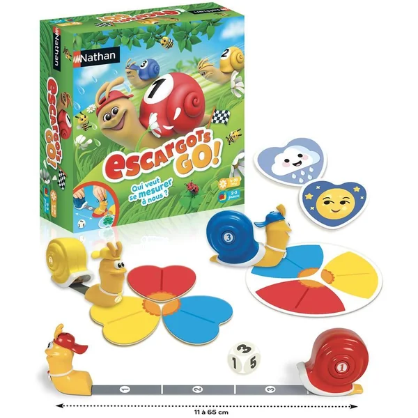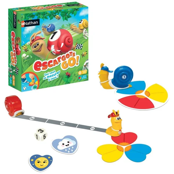Un jeu de course dans lequel les escargots peuvent être plus rapide qu’on ne pourrait imaginer. Chaque escargot contient un mètre enrouleur dans sa coquille. Chacun leur tour les enfants avancent leur escargot selon le nombre indiqué sur le dé. 3 mode de jeux : La course: les escargots sont alignés, le premier à passer la ligne d’arrivée à gagné. La chasse aux pétales niveau 1 : les escargots partent à la recherche des cartes de couleur. On joue sur une distance courte et à plat. La chasse aux pétales niveau 2 : on joue sur de grandes distances et en hauteur. Contient 3 escargots mesureurs en plastique, 1 dé, 18 pétales de couleur (6 rouges, 6 jaunes, 6 bleus) et 1 disque de départ (recto « fleur » et verso « ligne de départ »). De 2 à 3 joueurs. Durée de la partie : 10 minutes