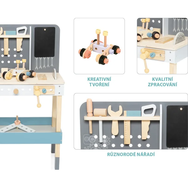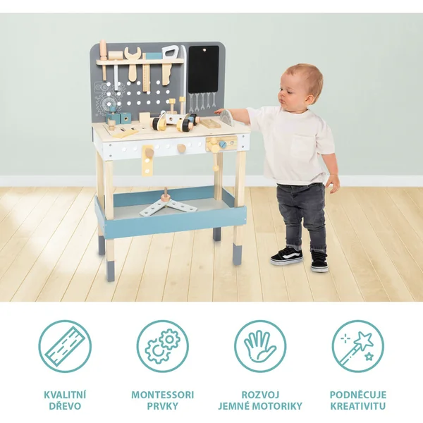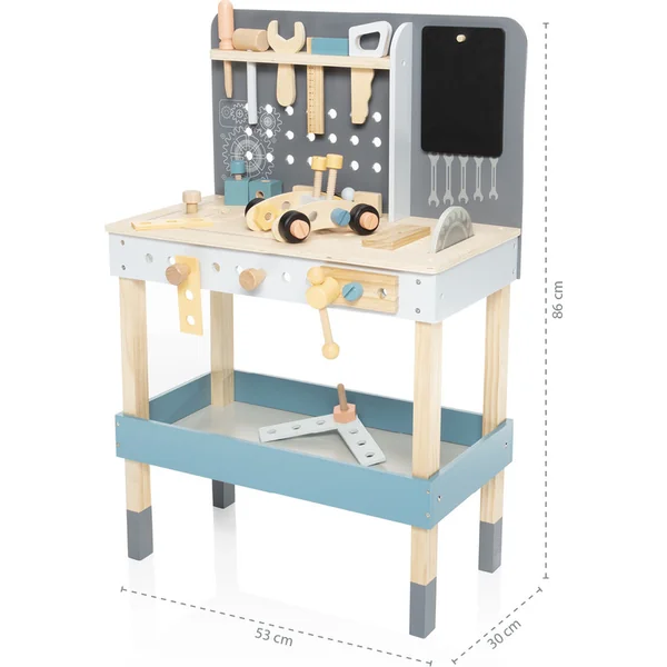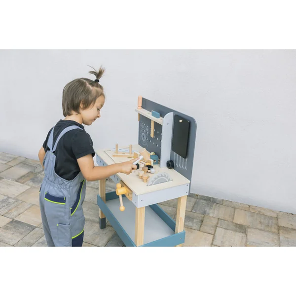 Un établi spacieux qui ne devrait manquer dans aucun atelier d’enfants. L’établi comprend un grand plateau circulaire avec divers composants – des planches en bois aux vis en passant par les écrous. Sous le plateau se trouve un espace de rangement. Il comprend également une étagère avec des trous pour suspendre un marteau en bois, un mètre ruban et une scie. L’établi est fabriqué en bois de qualité et en peinture à base d’eau. Il développe les compétences motrices et l’imagination.
