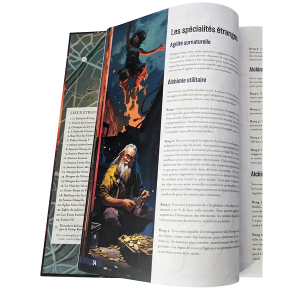 - Les factions de l’Étrange : Plus de 150 pages de Lore détaillent les factions surnaturelles, les lieux emblématiques et les figures marquantes qui composent la France secrète de 1989. Chaque faction offre un aperçu unique de ce monde caché et de nombreuses amorces sont proposées pour que vous donniez la direction de votre choix au pays des Lumières et des Ombres.