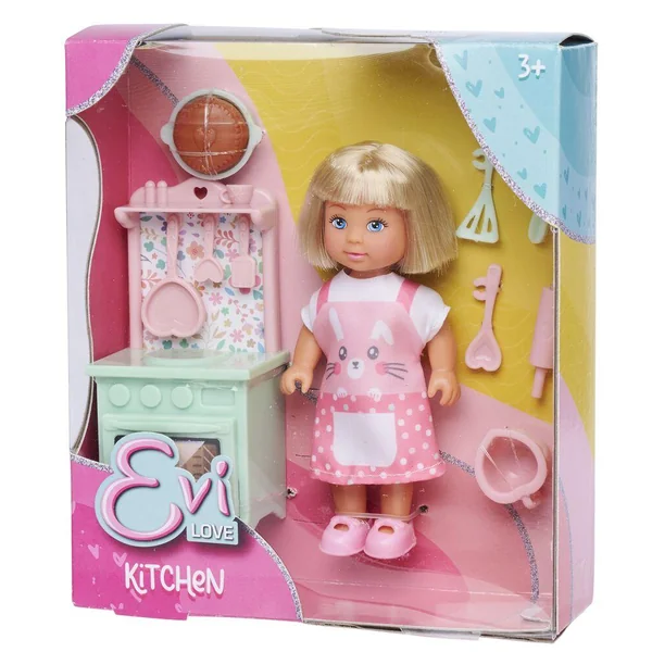 Evi fait un gâteau dans sa jolie cuisine tendance. Elle peut utiliser tous les accessoires pour cuisine. Le four s’ouvre et le gâteau gonfle quand il est cuit.