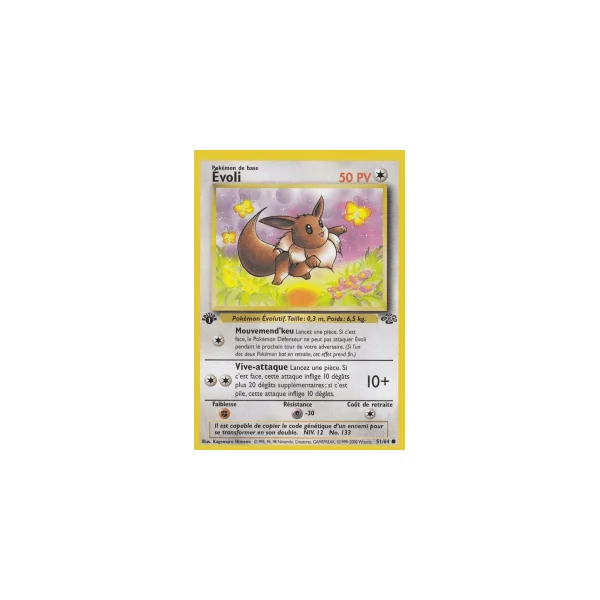Découvrez Évoli (ju051), une carte Pokémon de l’extension Jungle, provenant du bloc Wizards. Idéale pour compléter votre collection, cette carte Commune plaira autant aux collectionneurs qu’aux joueurs.