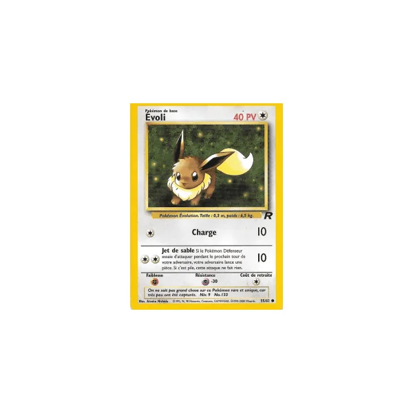 Découvrez Évoli (tr055), une carte Pokémon de l’extension Team Rocket, provenant du bloc Wizards. Idéale pour compléter votre collection, cette carte Commune plaira autant aux collectionneurs qu’aux joueurs.