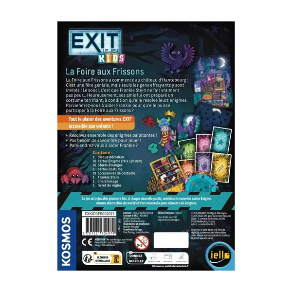 Exit Kids 3 : La Foire aux Frissons est un jeu de société pour les enfants jouable de 1 à 4 joueurs, dès 5 ans pour des parties de 20 minutes, édité par Iello.