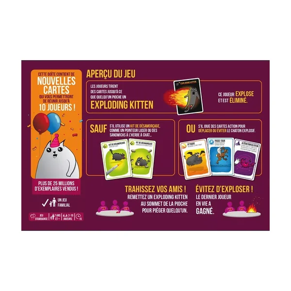 Dans Exploding Kittens, vous avez le droit d’avoir tout un tas de cartes en main. Quand vient votre tour, vous pouvez en jouer autant que vous voulez, pour faire les pires crasses à vos amis. Attendez-vous à des effets de cartes violents et stupides, on n’est pas là pour se faire des papouilles ! Quelle que soit votre décision, vous devrez de toute façon piocher une carte et serrer les coussinets pour ne pas tomber sur une carte « Exploding Kittens ». Si c’est le cas, vous avez perdu. Vous pouvez laper un bol de mojito-croquette, tout en admirant les illustrations foutraques et déjantées qui ont fait la renommée de ce petit jeu d’un mauvais goût assumé, en attendant qu’un seul joueur survive à ce déploiement de violence gratuite. Voilà, vous êtes prêts à perdre vos amis. (En même temps, on vous avait prévenus.)