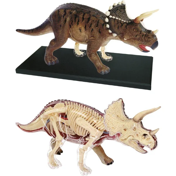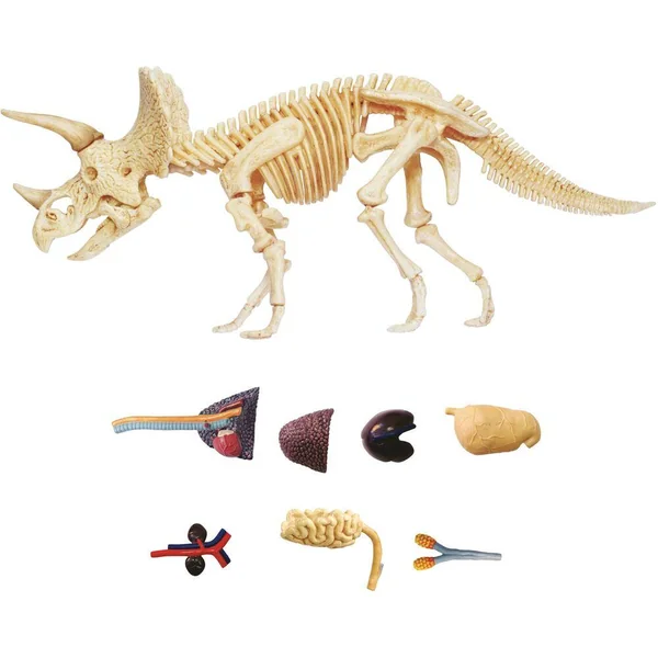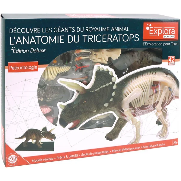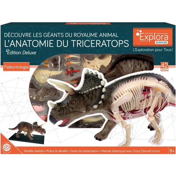 Ce kit de découverte contient : 1 Tricératops, 1 socle, 1 manuel avec 1 notice de montage et 1 quizz .